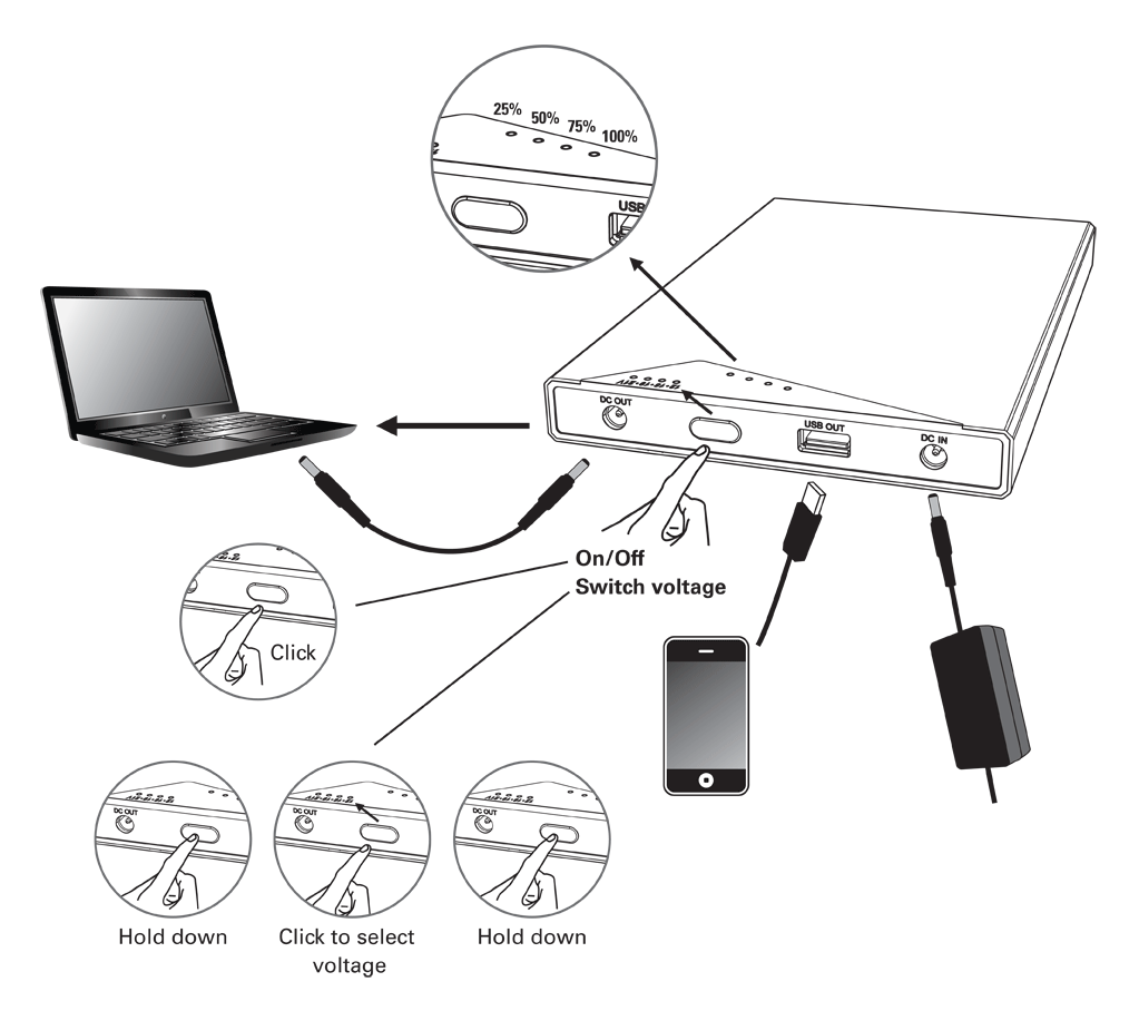 - IMPORTANT: Set the power bank to the number of volts that your laptop computer needs.